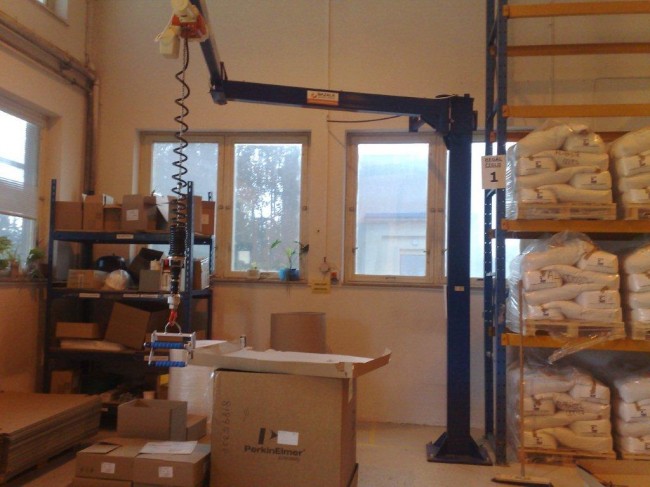Sloupový jeřáb kloubový s elektrickým řetězovým kladkostrojem a mechanickým uchopovačem